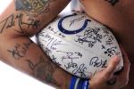 Ellis has signatures of 31 different Colts players and two coaches from the 2006 NFL championship team tattooed on his body. “My legs are both covered from the knees down,” he said. He’s scored the majority of the autographs during Colts training camp in Terre Haute over the past three years and still has 21 more signatures to get from the Super Bowl-winning team. Both Marvin Harrison and Bob Sanders remain high on his must-have list. “I feel they are two of the most valuable to obtain, so they’re right there with the best of the best,” said Ellis. “I’m afraid I might be going to the grave without Marvin’s, but we’ll see what happens.”